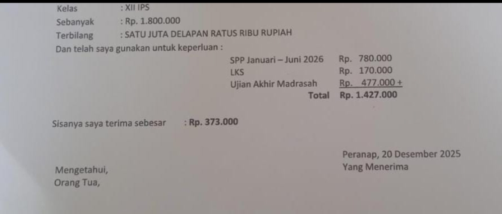 Namun demikian, fakta di lapangan telah menunjukkan kondisi yang berbeda; misalnya, seorang siswa penerima PIP telah mengungkapkan kekecewaannya bahwa dari dana Rp1,8 juta yang cair, mereka hanya menerima sebesar Rp373 ribu — selanjutnya, rincian pemotongan dijelaskan sebagai berikut: SPP Januari–Juni 2026 sebesar Rp780 ribu, LKS Rp170 ribu, dan ujian akhir Rp477 ribu.
