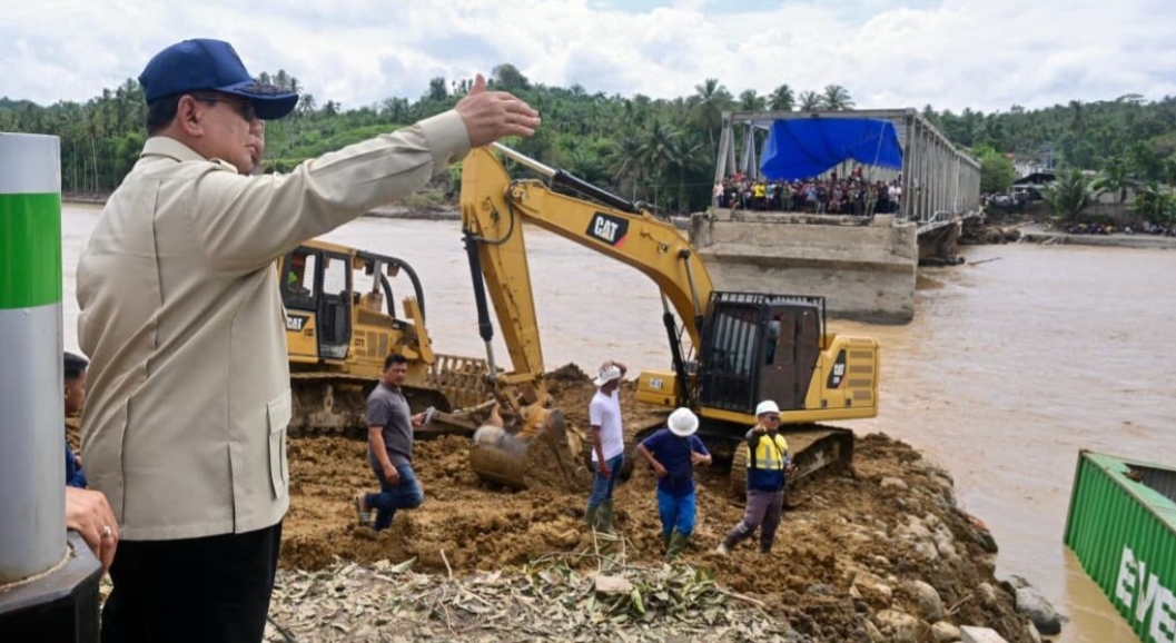 Presiden Prabowo Subianto meninjau pembangunan Jembatan Bailey Teupin Mane, ruas vital penghubung Bireuen-Takengon di Kabupaten Bireuen, Provinsi Aceh, Minggu, 7 Desember 2025.